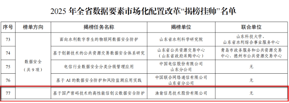 近期,山东省大数据局公布了《2025年全省数据要素市场化配置改革“揭榜挂帅”名单》。888集团6008信息独立申报的“基于国产密码技术的高性能信创云数据安全防护”项目,凭借在数据安全与要素流通领域的技术创新与实践成果,从众多单位中脱颖而出,成功入选。888集团6008信息成为揭榜单位中唯一的商密企业。