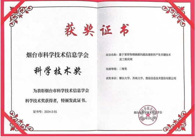 近期,2024年度烟台市科学技术信息学会科学技术奖颁奖典礼在中国科研实验室烟台海岸带研究所隆重举行。888集团6008信息与烟台大学、苏州大学联合完成的 "基于宽带物理熵源的超高速密钥产生关键技术及工程应用" 项目荣获科学技术奖二等奖。